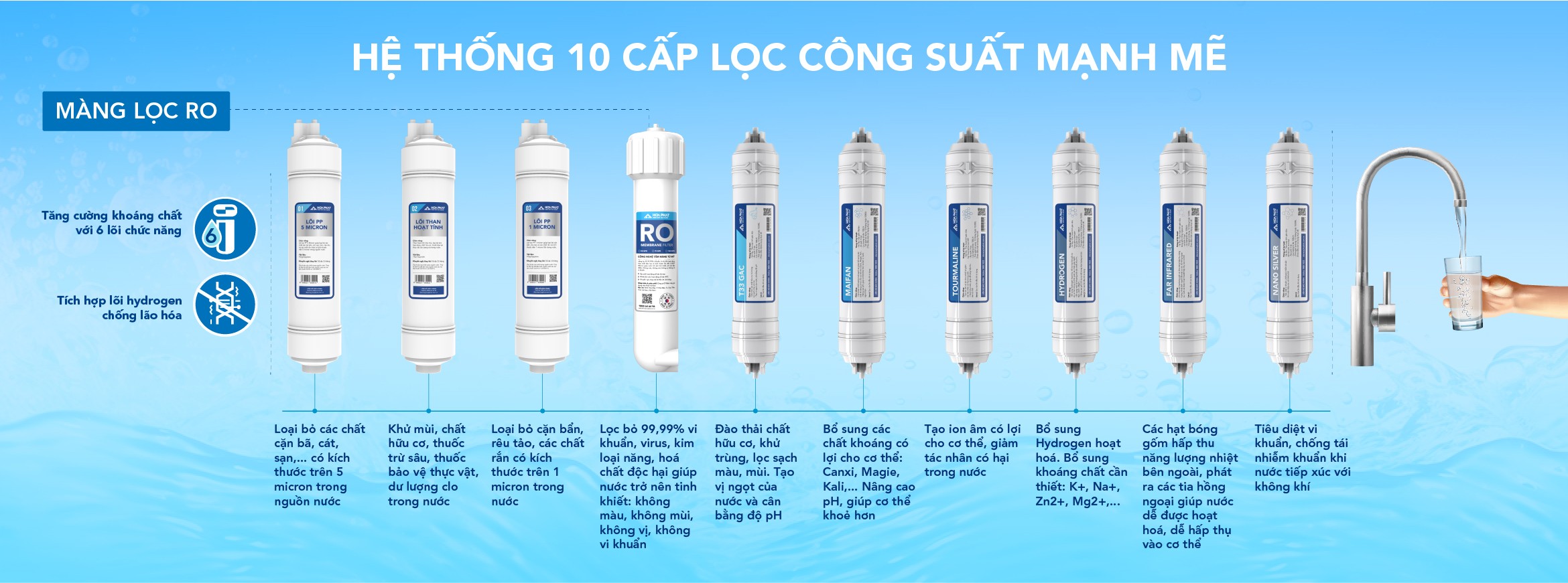 Máy được trang bị 10 lõi lọc cao cấp, kết hợp giữa các lõi lọc thô, màng RO và cụm lõi chức năng.