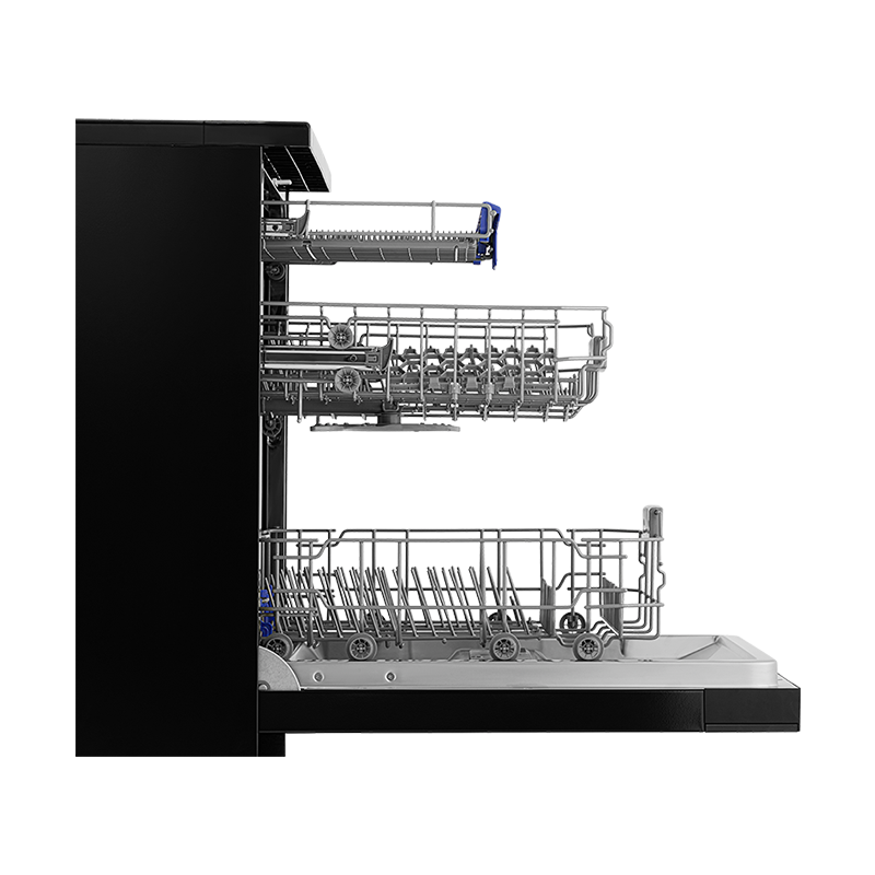 3 Giàn Rửa: Thiết kế 3 tầng rửa (giàn trên cùng chuyên dụng cho dao dĩa, phụ kiện nhỏ) giúp việc sắp xếp bát đĩa trở nên khoa học và tối ưu hóa không gian rửa.
