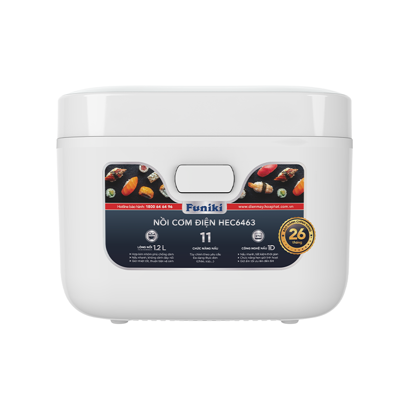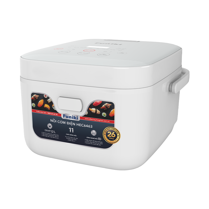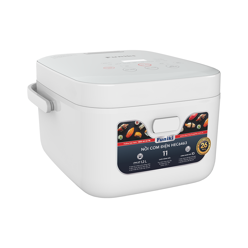 Nồi cơm điện tử Funiki HEC6463 là dòng sản phẩm cao cấp, sử dụng công nghệ điều khiển bằng vi mạch điện tử. Với dung tích 1.2 lít, chiếc nồi này được thiết kế tối ưu cho các gia đình nhỏ (khoảng 2 – 4 người) hoặc những người độc thân. Nó mang lại chất lượng cơm ngon, dẻo cùng với sự tiện lợi và đa chức năng của nồi cơm điện tử.